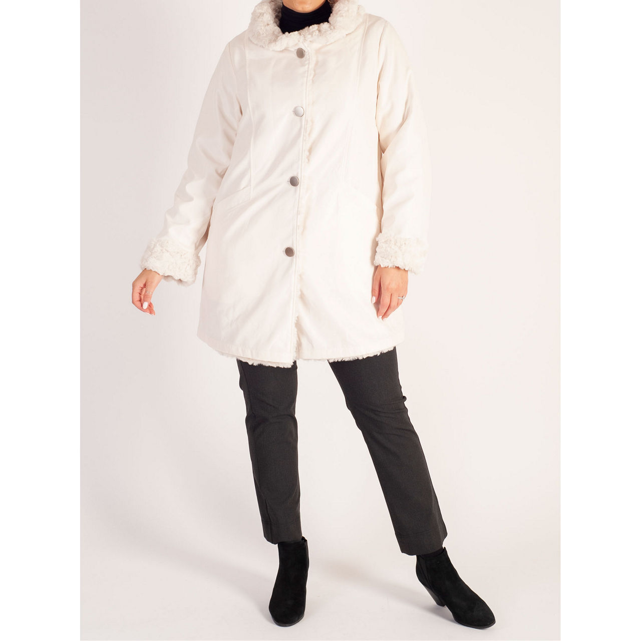 Black Faux Fur Reversible Coat Faux Fur on One Side Raincoat on the Other Very well made.