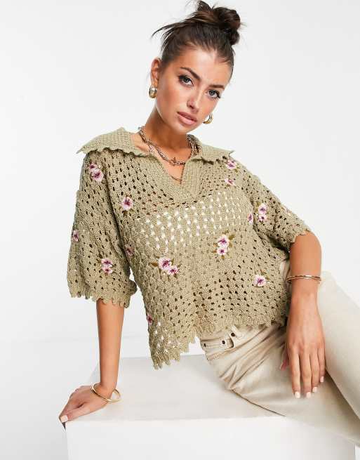 Mango Top in maglia a uncinetto verde kaki con colletto e fiori ASOS Very well made.