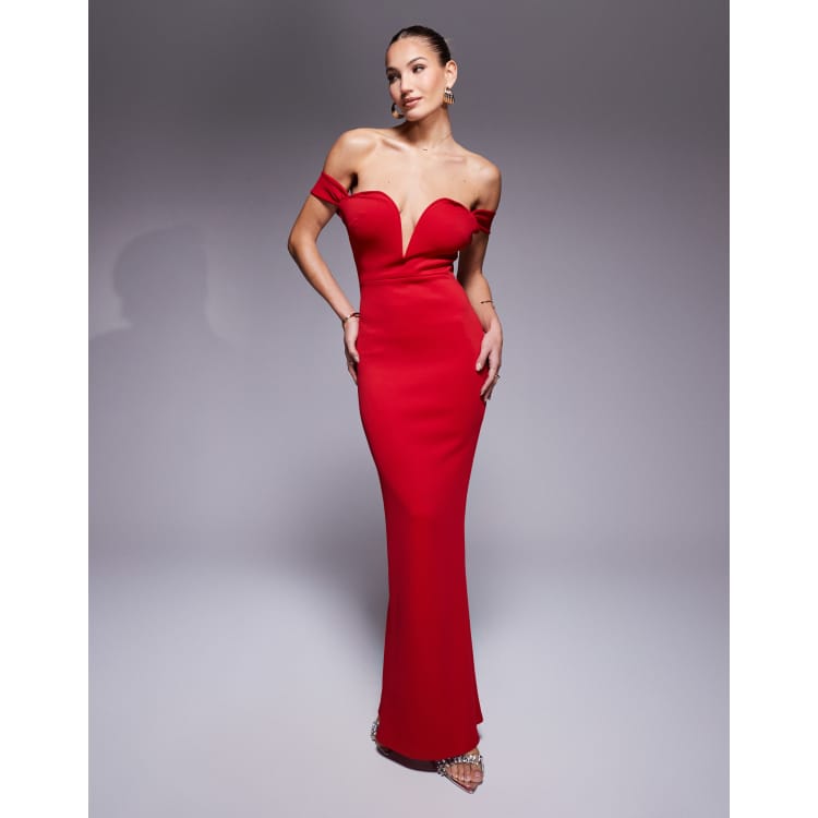 True Violet plunge neck off shoulder maxi gown in red ASOS Very well made.