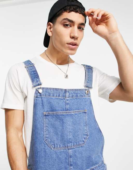 ASOS DESIGN denim dungaree in mid wash with knee rips Very well made.