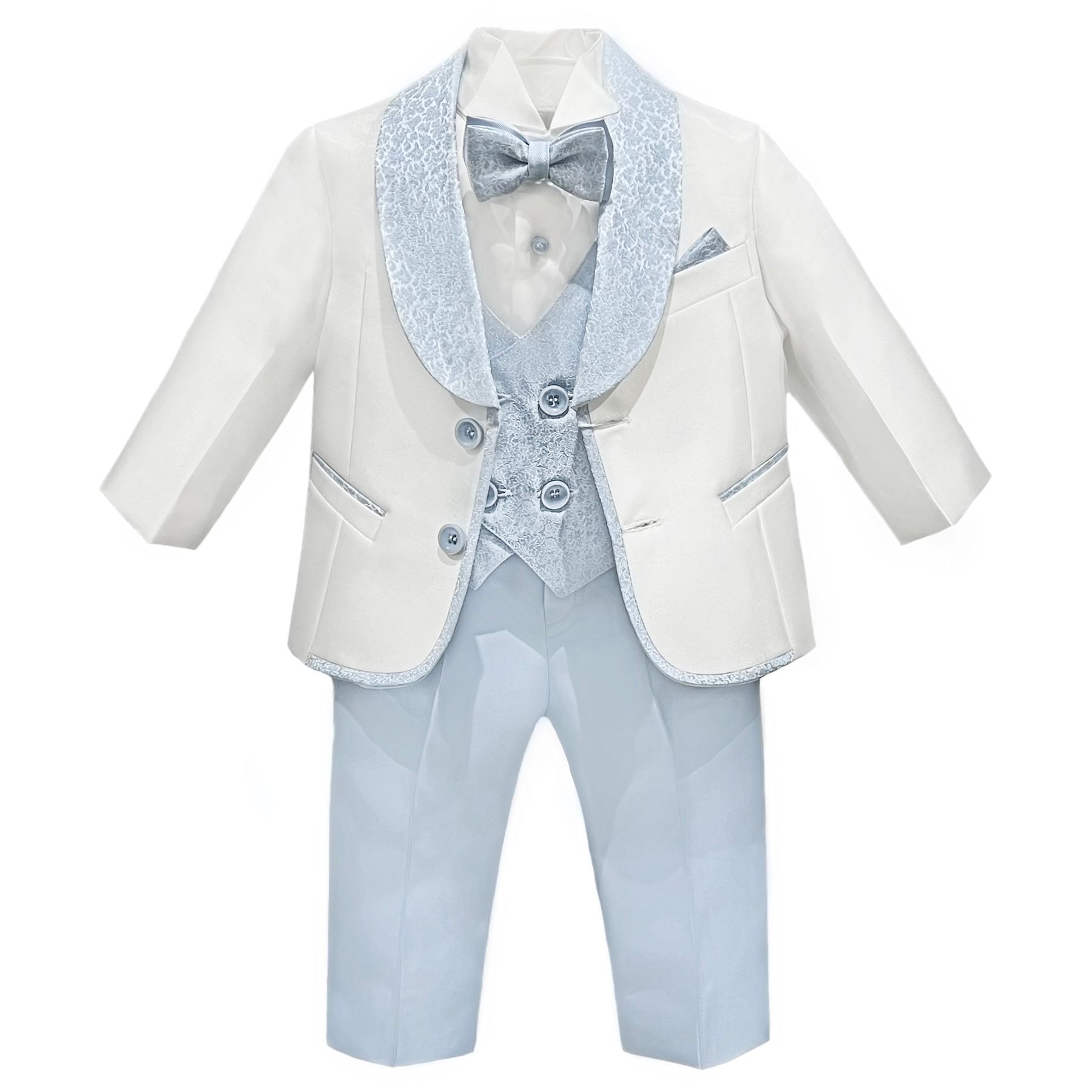 1710 Abito da battesimo 5pz maschietto manica corta bianco con gilet a fantasia Very well made.