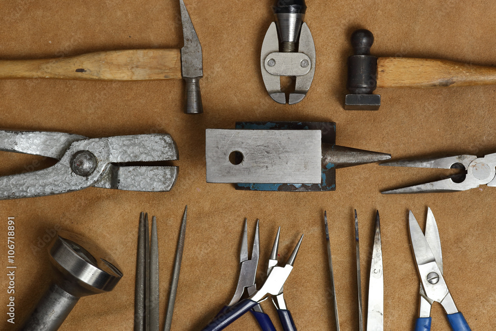 Tools of jewellery. Jewelry workplace on leather background with copy space for text. Top view. Stock Photo Adobe Stock Very well made.