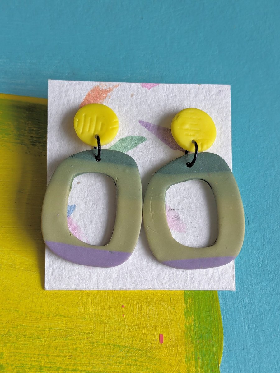 Statement dangly earrings bright yellow green and purple polymer clay earring Very well made.